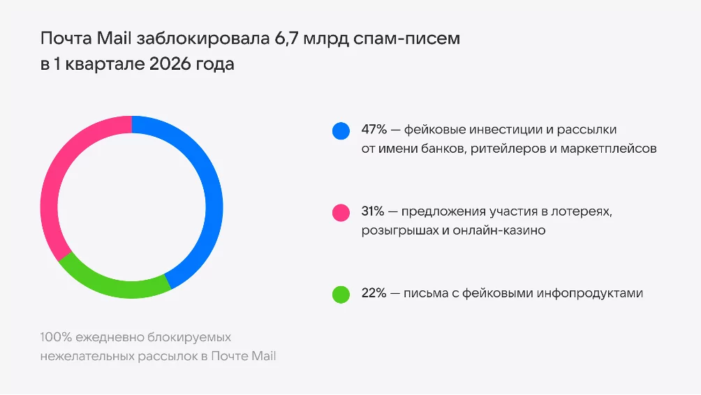 Почта Mail подвела итоги работы своих антиспам- и антифишинг-систем за первый квартал 2026 года. За отчетный период количество заблокированных вредоносных писем снизилось на 5,6% по сравнению с 2025 годом и составило 6,7 млрд. В тренде — письма под видом уведомлений от государственных сервисов с угрозой о штрафах и сообщениями о задолженностях. В марте были особо популярны письма о доставке с предложением принять цветы или подарок в честь гендерного праздника. Эти письма выглядят как дружеские поздравления, но ведут на ресурсы, где злоумышленники получают личные данные и доступ к финансам пользователей.