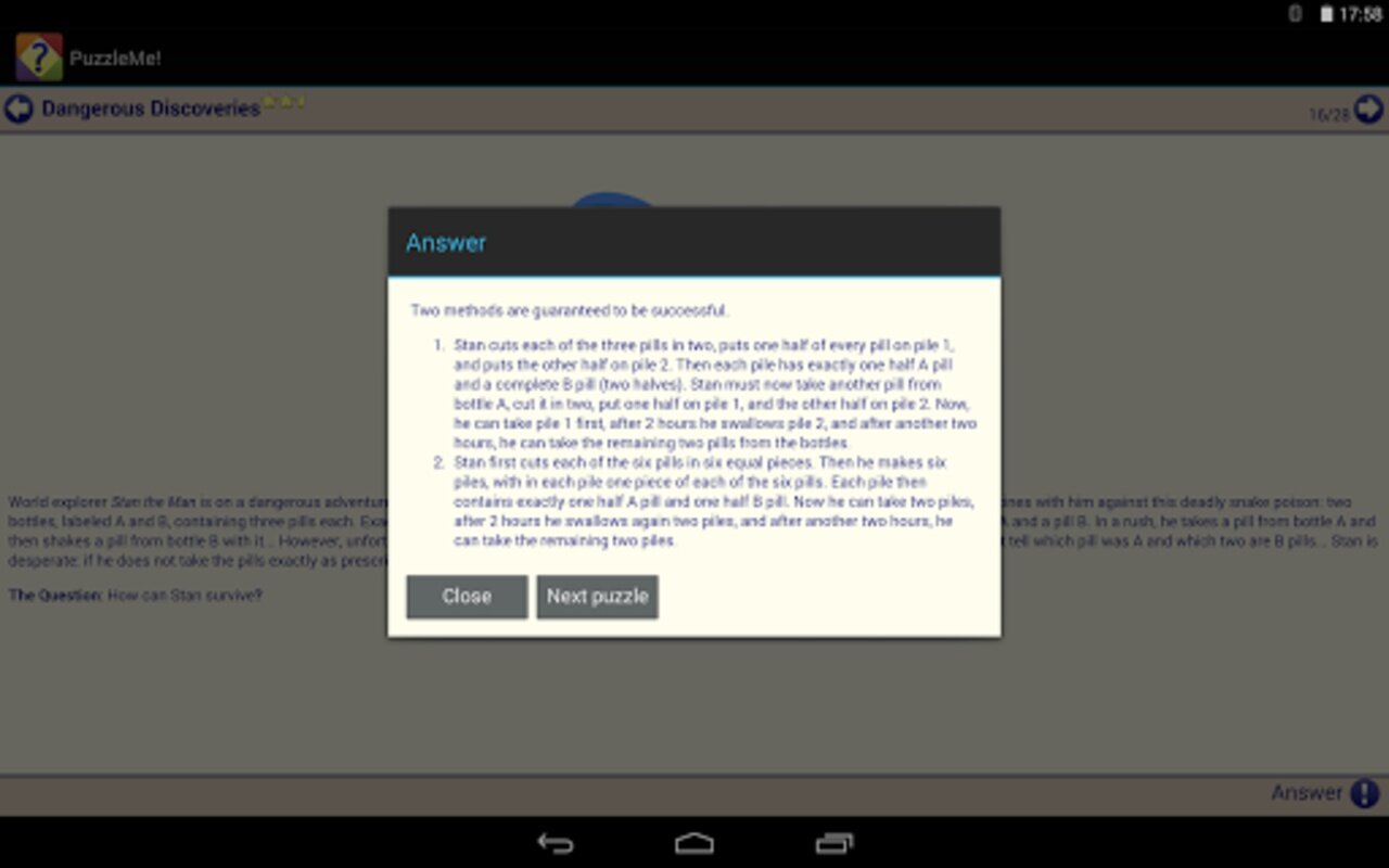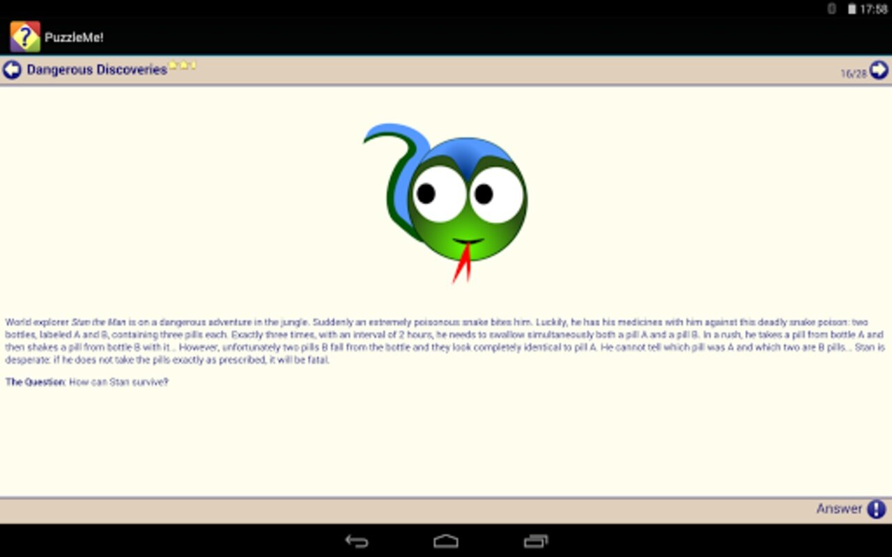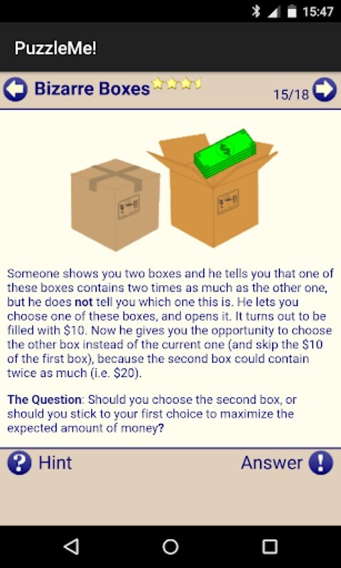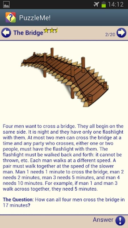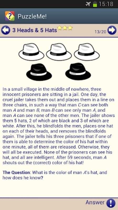 Пазлы и загадки сгруппированы в удобные категории, такие как: простые, монеты и спички, математика, логические, головоломки-дразнилки и шутки. И они оцениваются звездами от простых до чрезвычайно сложных.