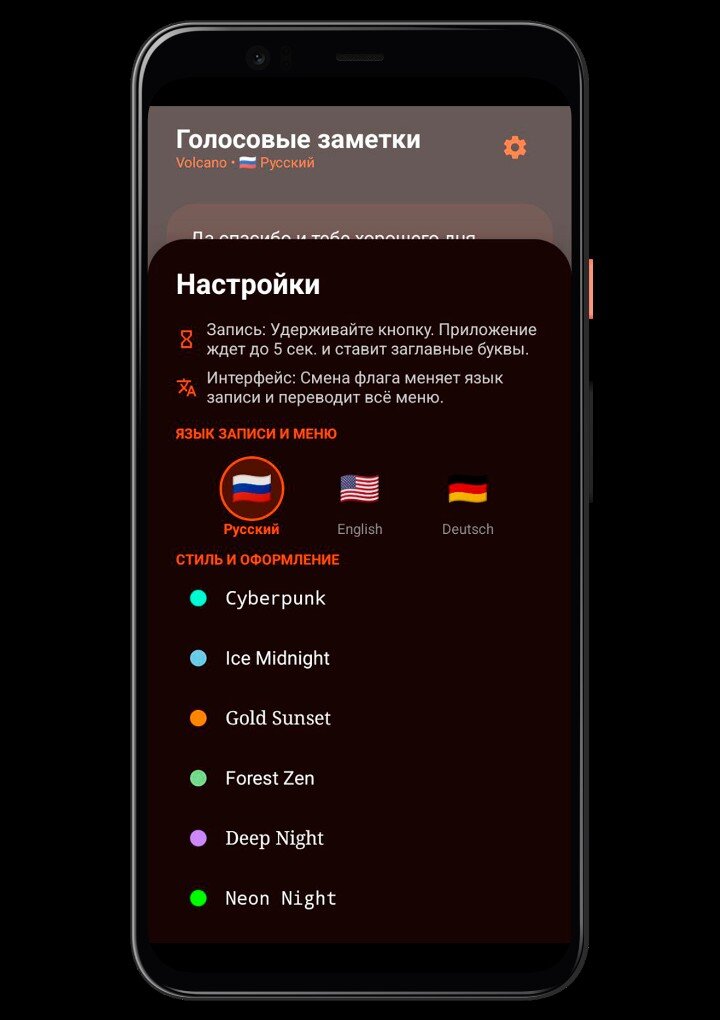 Превратите свой голос в текст мгновенно! Наше приложение создано для тех, кто ценит время и хочет фиксировать идеи на лету, не отвлекаясь на клавиатуру. Почему стоит выбрать нас? Умные паузы: Мы увеличили время ожидания до 5 секунд. Больше не нужно торопиться — делайте паузы, собирайтесь с мыслями, запись не прервется! Идеальный текст: Приложение автоматически начинает предложения с заглавной буквы и исправляет мелкие ошибки распознавания. Стильный интерфейс: Выбирайте из 9 уникальных тем — от футуристичного Cyberpunk до нежной Sakura. Полная приватность: Ваши заметки хранятся только на вашем устройстве. Мультиязычность: Поддержка русского, английского и немецкого языков. Записывайте идеи, составляйте списки дел и сохраняйте важные моменты одним нажатием!