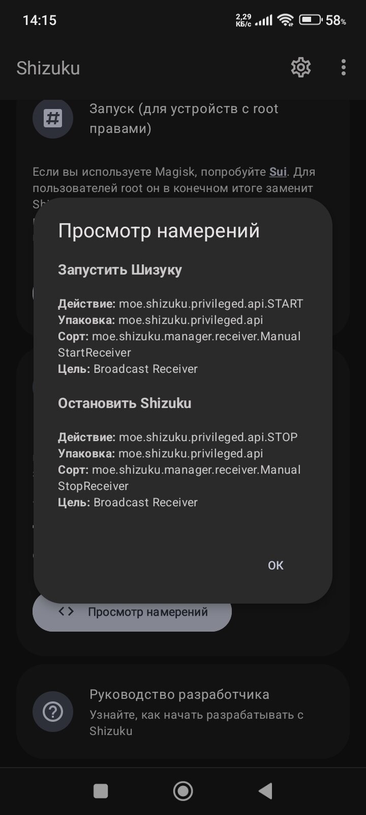 - Сторожевой пёс (watchdog): полезная функция, позволяет при сбое Shizuku автоматически перезапускать Shizuku в фоновом режиме.