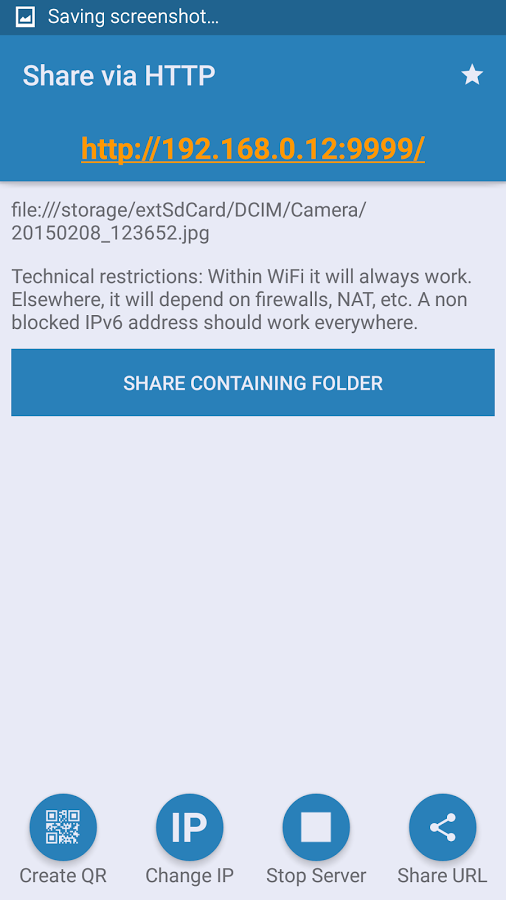 Share via HTTP – cамый простой способ поделиться файлами с вашего Android на любое устройство. Просто выберите один или несколько файлов. Это приложение откроет HTTP-сервер, с которого любой желающий сможет скачать файл. Вы также можете из любого приложения Android нажать на «поделиться» и «Поделиться через HTTP». Ссылкой всегда будет IP-адрес вашего телефона на порту 9999. Example: 10.1.1.100:9999/