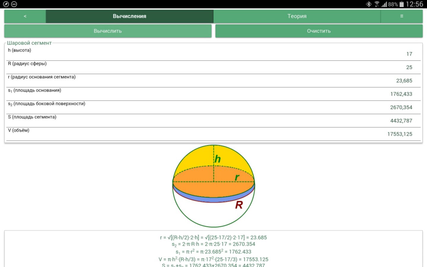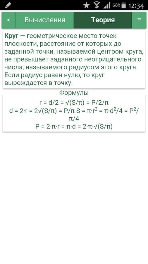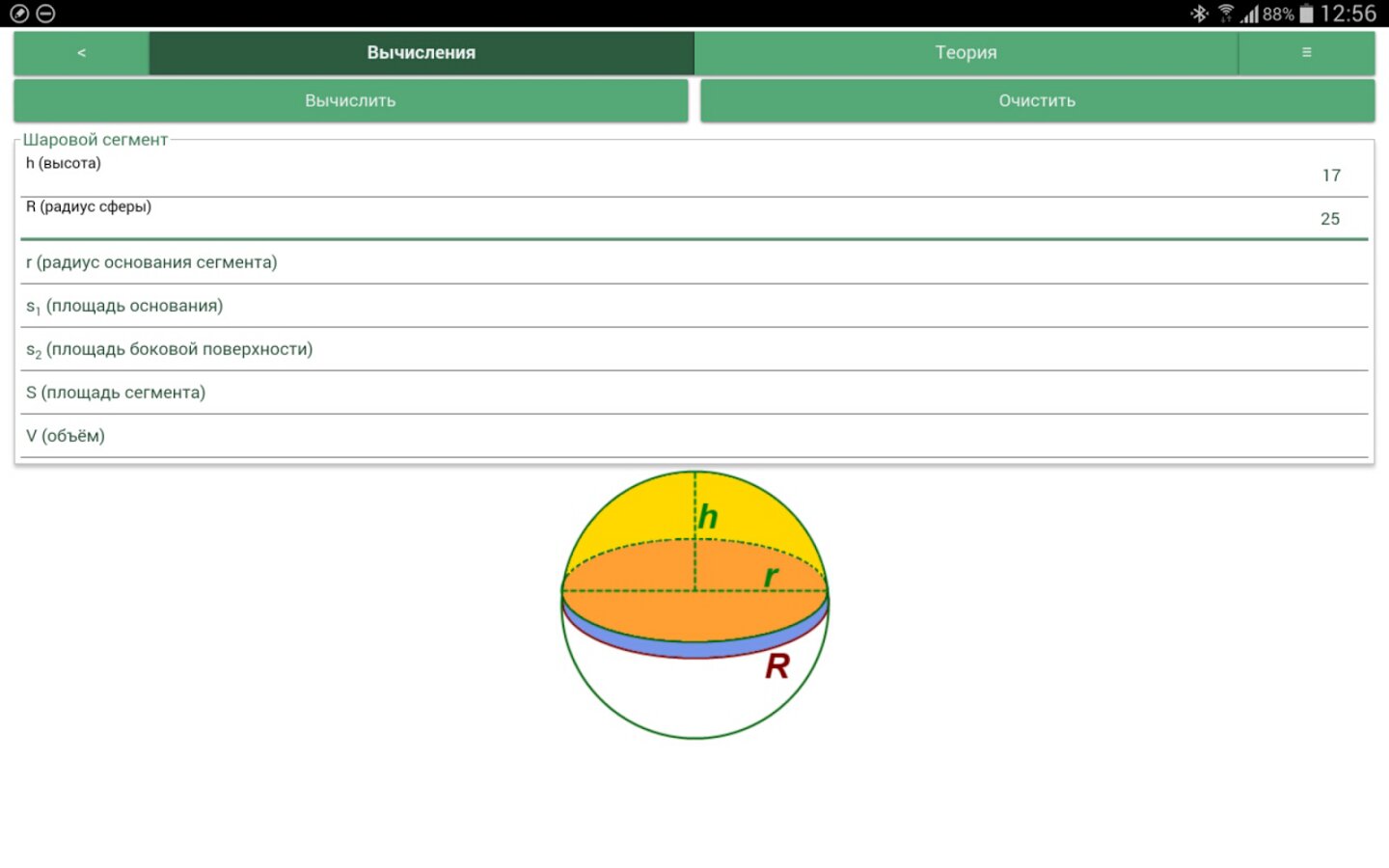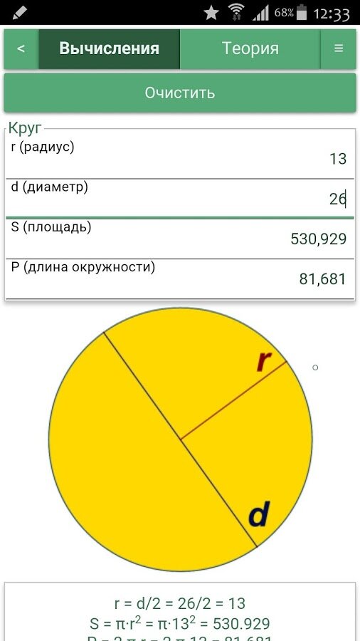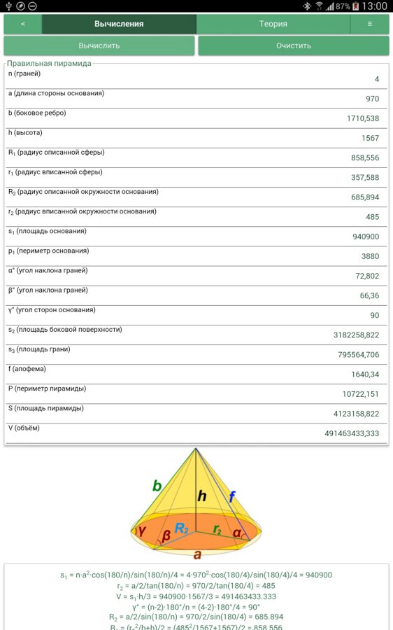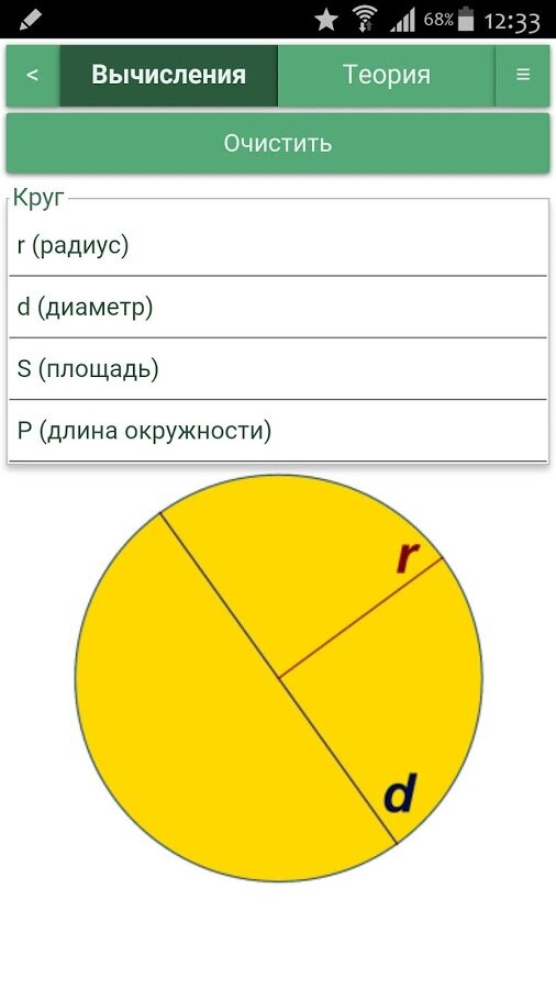 Для каждой фигуры – один калькулятор. Неважно, знаете ли Вы высоту и радиус или радиус и объем. Просто введите известные переменные, и программа сама выберет по каким формулам найти недостающие параметры.