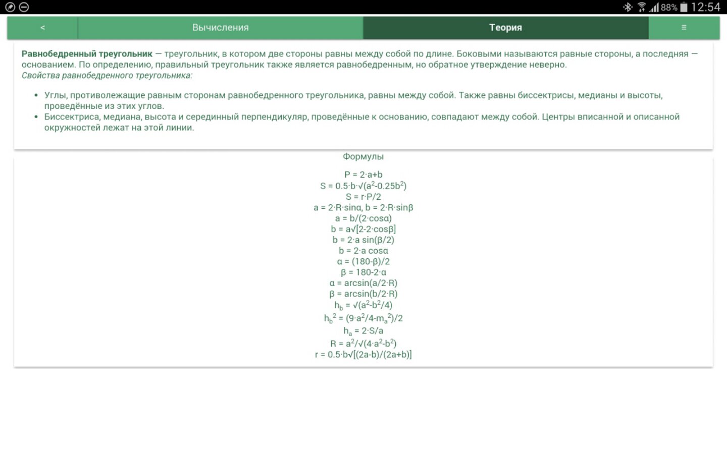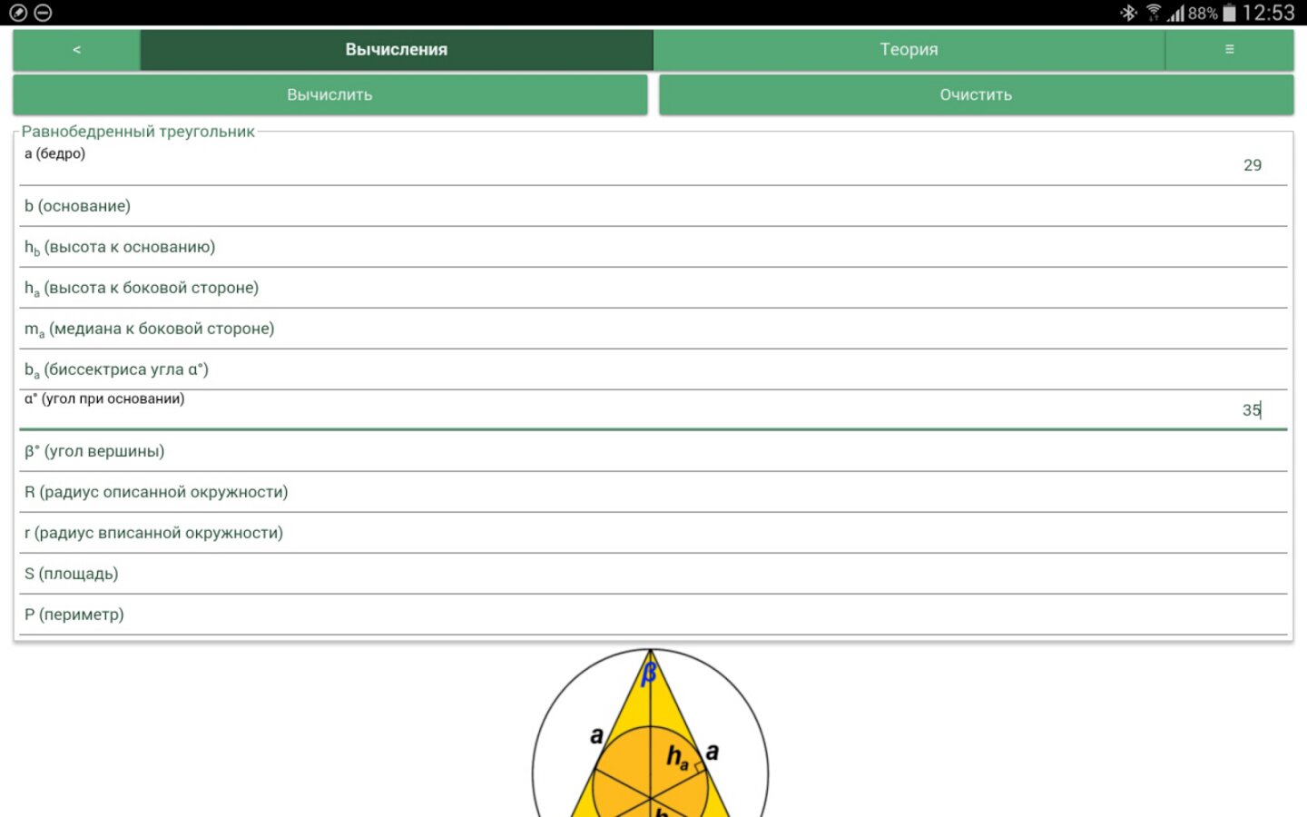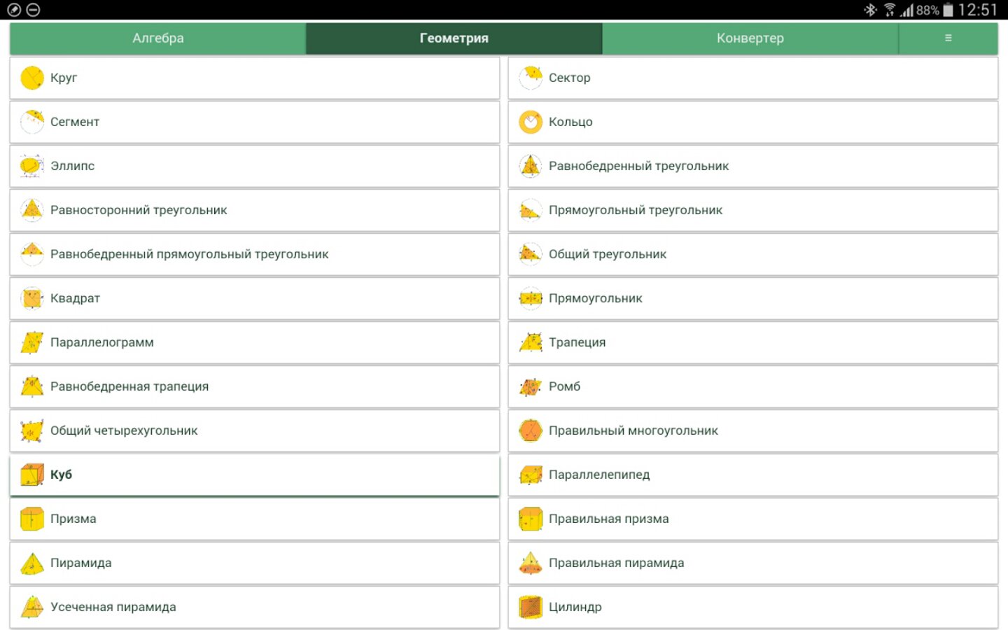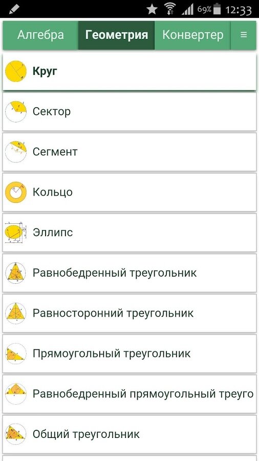 Для каждой фигуры – один калькулятор. Неважно, знаете ли Вы высоту и радиус или радиус и объем. Просто введите известные переменные, и программа сама выберет по каким формулам найти недостающие параметры.
