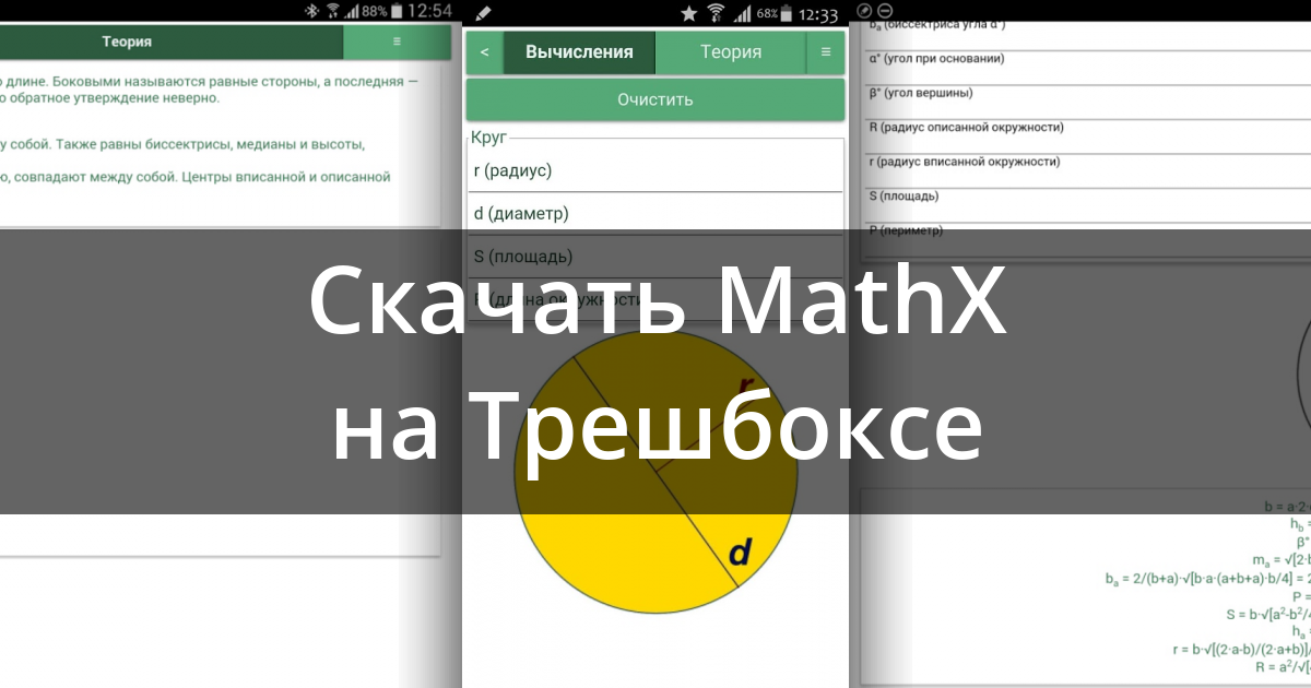 MathX — математическая программа-помощник. Позволяет рассчитывать большинство параметров двухмерных и трехмерных геометрических фигур, конвертировать единицы измерения и проводить алгебраические вычисления.