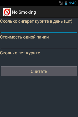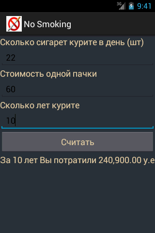 No Smoking! — калькулятор потраченных денег на сигареты. Хотите узнать сумму потраченных на сигареты денег за время курения?