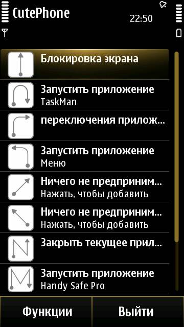 Рад представить вам хорошую программу, которой пользуюсь и сам. Эта программа предоставляет возможность управлять нашими смартами с помощью свайп-жестов. В самой программе показаны возможные жесты, ну и на них вешаем желаемые действия, например блокировку, диспетчер задач, закрытие текущего приложения, установленное приложение… В этой версии 1.60(0) улучшена стабильность, работа в ландшафтном режиме, работа в различных приложениях кроме списка исключений. В отличии от ранних версий с камерой не конфликтует. Для уверенного пользования надо немного потренироваться в выполнении жестов, при срабатывании прога показывает исполняемый жест. В общем пробуем, программа небольшая, увеличения расхода батареи не заметил.Обновление до 1.70(0):•Run application•Call / SMS contact•Lock screen•Close open apps•Task switcher•Music (play/Pause, Next, Previous)Дата выхода: 8.04.2013Разработчик: CuteSoftПоддерживаемый язык[и]: РусскийПлатформа (ОС): S60v5 S^3 Anna BelleСтатус: Retail dersimli_62