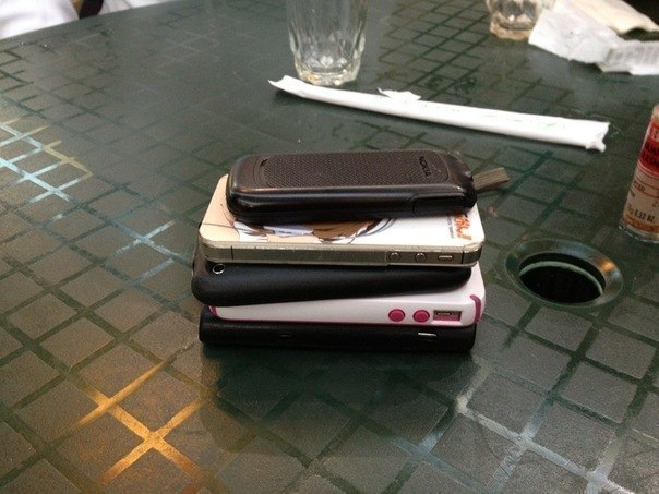 Игра под условным названием «Не будь чмошником за ужином с друзьями» заключается в том, что все телефоны, смартфоны и другие гаджеты для связи с внешним миром складываются в стопку экранами вниз. Первый, кто не выдержит и вытащит свой гаджет, среагировав на издаваемые им звуки разных оповещений, платит за ужин всей компании.