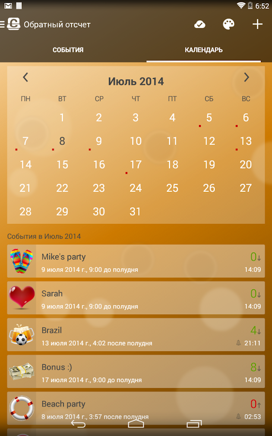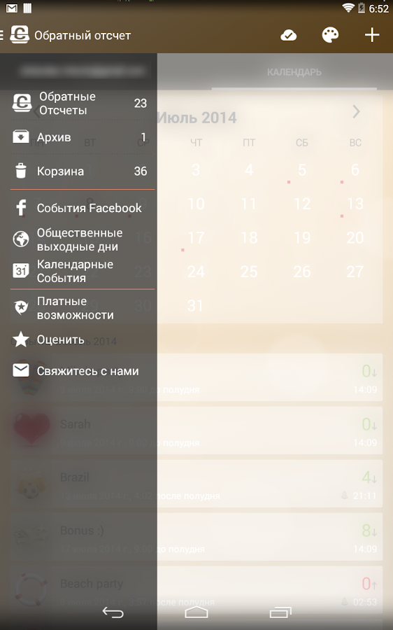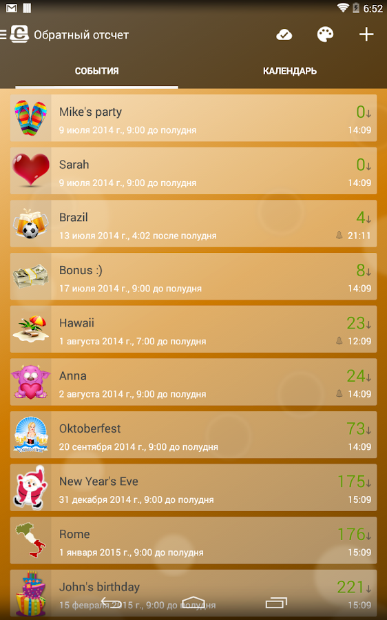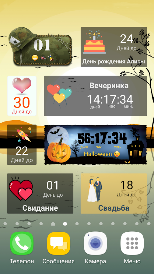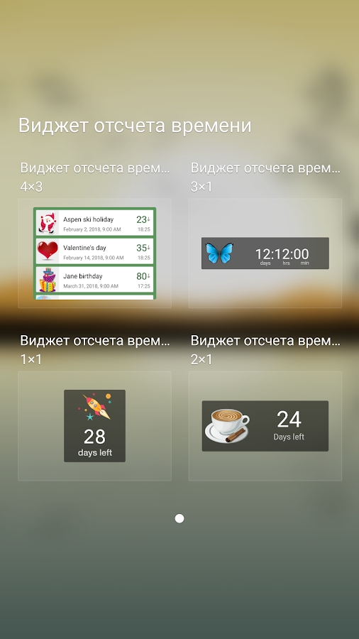Виджет отсчета времени — это бесплатное приложение, которое напоминает Вам о важных событиях в вашей жизни, и это очень просто в использовании. Не пропустите больше день рождения, юбилей, свадьбу или матч. Вы вручную настраиваете сколько времени осталось до какого-то важного события, такого как: роды, военная служба, заработная плата, бонусы, Рождество, Новый год или катание на лыжах! С новыми, красивыми темами виджет не только полезен, но и выглядит красиво. Но это еще не все: вы можете добавить несколько различных событий. Например, установите дату, когда вы получаете годовую премию (бонус) на работе, а на следующий день – в дорогу на Гавайи. Виджет отсчета времени доступен в 3 разных размерах — 1x1, 2x1 и 3x1. С маленьким и средним виджетами, вы можете отслеживать количество дней, оставшихся до события. Но с большим виджетом, вы можете отслеживать и количество часов и минут для дополнительной пунктуальности.