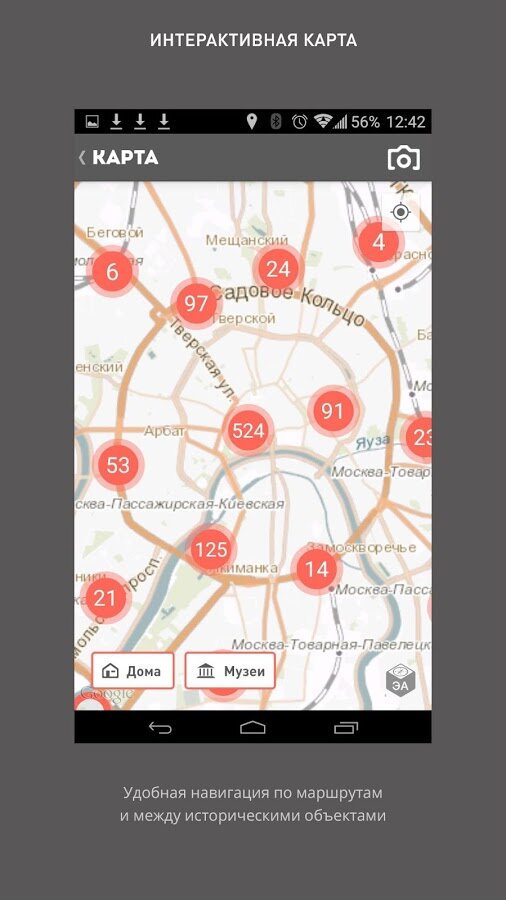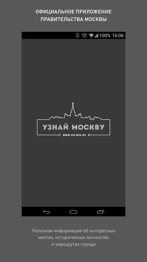 Узнай Москву — интерактивная карта Москвы с архитектурной историей. Официальное приложение от правительства Москвы. С помощью приложения пользователь может составлять маршруты, отмечая необходимые места на интерактивной карте столицы и визуально оценивать расстояние между ними. Также предусмотрена возможность использования рекомендуемых маршрутов, подготовленных специалистами проекта.