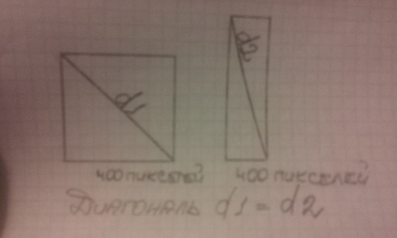 Так вот, к чему это все я веду. Представь, что и в квадрате, и в прямоугольнике количество пикселей одинаковое — и там, и здесь 400х800. Диагонали тоже одинаковы. А теперь вопрос. Будет ли при прочих равных одинакова плотность пикселей? ))
