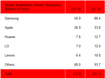 Южнокорейский технологический гигант, компания Samsung, продала на 55% больше смартфонов, чем в третьем квартале прошлого года — 88.4 миллиона смартфонов и 35% рынка. Компания Huawei может похвастаться реализацией 12.7 миллиона смартфонов, подняв собственные продажи на 67%. Наиболее популярными моделями выступили Huawei G610 и Huawei Ascend P6. Продажи компании LG выосли на 71%, и, наконец, пятёрку замыкает компания Lenovo, заняв 4% рынка.