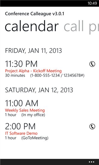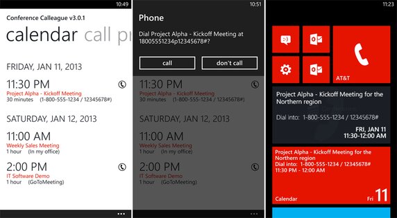 Conference Calleague — приложение для windows phone, с помощью которого вы сможете, сможете создавать телефонные конференции, записывать напоминания, сканировать календарь на писк следующих телефонных конференций. Отличная программа для делового человека и не только.