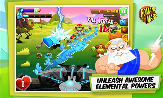 Romans From Mars — игра для Windows Phone, в которой по сюжету вы римский солдат, который препятствует вторжению марсиан на землю. К счастью, бог Юпитер на стороне землян. Он помогает им различными стихиями (огнем, льдом, землей и светом). Пользуясь помощью могущественного бога, вы должны отбивать одну волну марсиан за другой и не дать захватить ваш последний бастион. В игре приятная 3D графика и увлекательный геймплей.