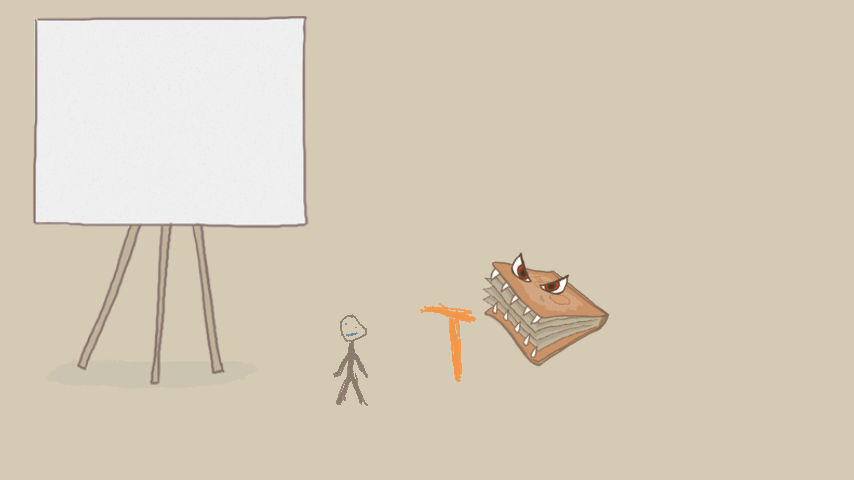 Потом, наш друг, прыгает с мольберта (зачем?) на котором мы занимались предыдущими вещами, но внизу его съедает какая-то книга.