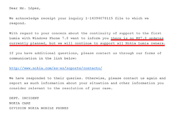 На картинке выше изображено то самое сообщение, где сообщается, что обновлений для WP7 больше не предвидится. Помимо этого, сотрудники Nokia Care указали, что они собираются поддерживать пользователей смартфонов Nokia Lumia. Сама Microsoft будет поддерживать Windows Phone 7 до сентября 2014 года.
