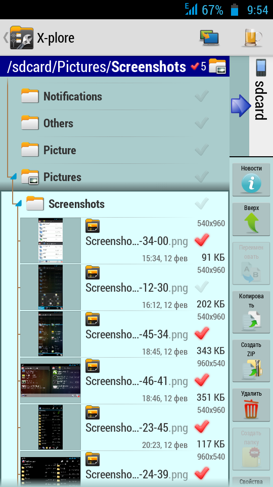У X-plore сбоку имеется панелька, которую можно пролистывать свайпами вверх-вниз. На них можно поместить любые нужные Вам кнопки, будь то «Cоздать ZIP», «Сортировка» или кнопка, отвечающая за перемещение в папку выше. Естественно, ни один файловик не обходится без стандартных функций (переименовать, копировать, удалить и т.д.), иначе без них — это уже не файловик. У X-plore они присутсвуют, и их также можно поместить на нашу боковую панель. Сами кнопки можно перемещать между собой, то есть одну поднять на первое место(например «копировать»), а кнопку, скажем, «удалить» — на четвёртую позицию. Делается все это очень просто, а сам файл-менеджер интуитивно понятен. Просто нужно привыкнуть. Но еще для всех этих операций можно зажать палец на необходимом файле и Вам выскочит список со всеми этими функциями. Разнообразие, однако :) Распаковка и запаковка файлов здесь достаточно простая, и всё просто отлично и быстро работает. Претензий никаких.