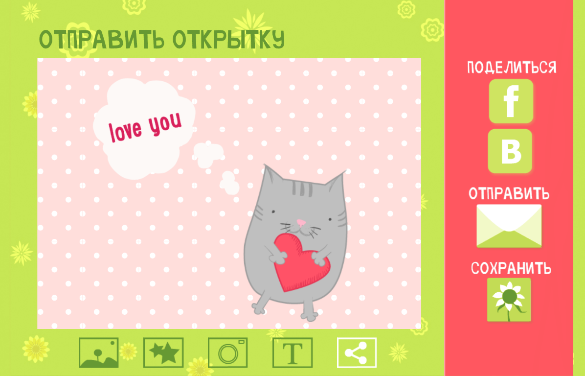 «Поздравительные открытки» — очень простое и милое приложение. Как понятно из названия, предназначено оно для создания открыток. В приложении представлен большой выбор категорий для творчества. Это и фоны, и различные объекты, и надписи.