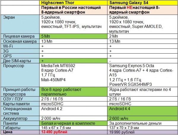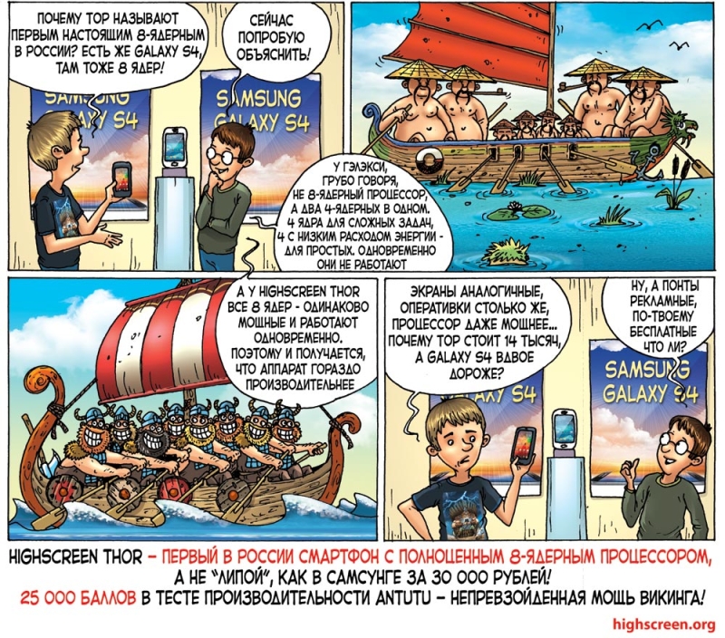 Почему «полноценные»? Потому что во флагманском Samsung Galaxy S4 ядра работают не одномоментно, а «посменно». По принципу 4 высокопроизводительных плюс 4 энергосберегающих. В Highscreen Thor же задействована схема, когда все восемь ядер участвуют в решении задач единовременно. Рекламщики Highscreen объясняют суть различий забавным комиксом.