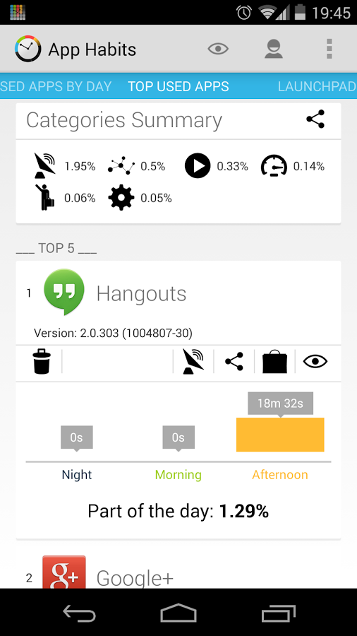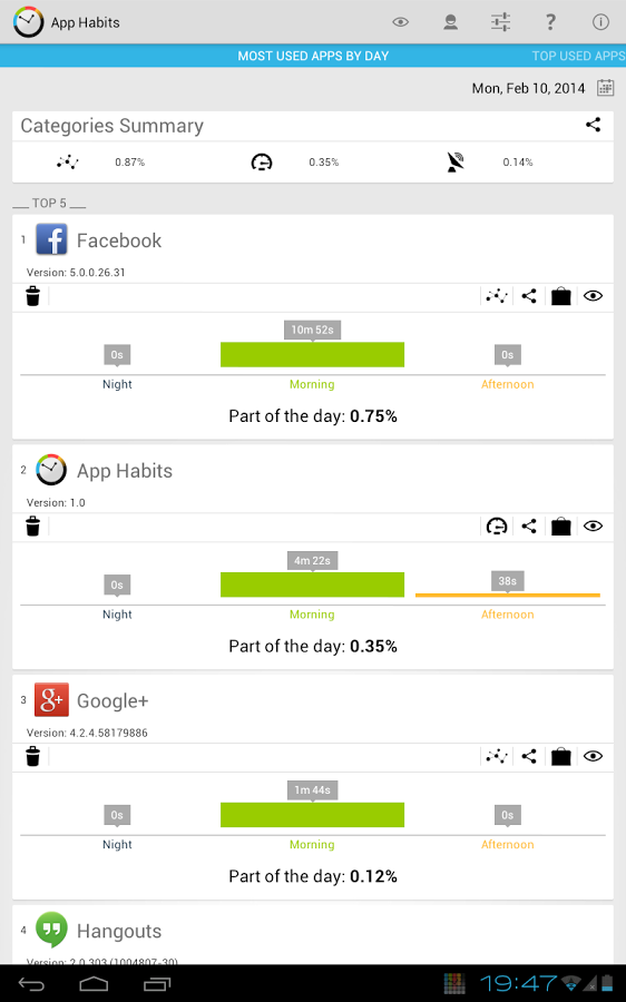 Программа разделяет время работы программ на утреннее, дневное и вечернее. Кроме довольно красивых графиков и понимания того, сколько времени вы «теряете» в некоторых приложениях, App Habits поможет тем людям, которые хотели бы оптимизировать свое время работы и улучшить свою производительность. Скачать App Habits можно бесплатно в Google Play.