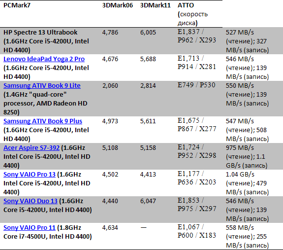 Как оказалось, отзывчивость этого ноутбука мне не почудилась. Spectre 13 показал себя лучше множества своих соперников, хотя и имеет похожий dual core процессор Core i5-4200U. За такие высокие результаты стоит благодарить SSD диск Liteon, благодаря которому достигаются высокие показатели считывания (527 MB/s) и записи(327 MB/s) данных.