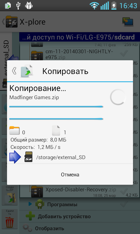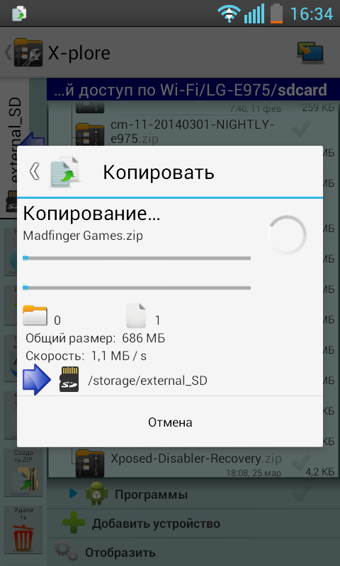 Я начал копировать архив Madfinger Games.zip который весит 702 мегабайта в Optimus L7: