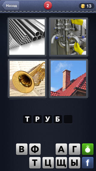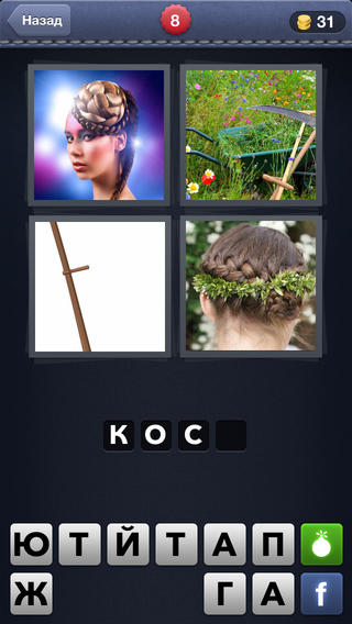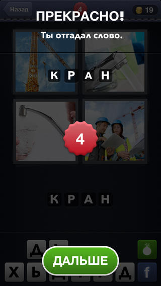 Интересная игра для вашего яблочного девайса! Полностью бесплатная и безопасная! В этой увлекательной игре, надо угадывать слово. Для подсказки — дается четыре картинки.