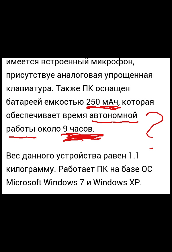 Имеется порт USB 2.0, разъем для SD-карт памяти и слот для SIM-карты, имеется встроенный микрофон, присутствует аналоговая упрощенная клавиатура. Также ПК оснащен батареей емкостью 2500 мАч, которая обеспечивает время автономной работы около 9 часов.