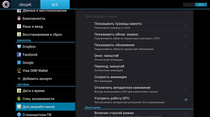 То есть, нам придется установить режим работы графического адаптера на максимальную производительность. Для этого идем в настройки -> для разработчиков, предварительно включив это меню -> ставим галочку на пункте «ускорить работу GPU». Данная настройка позволит ускорить функционирование игр, но с некоторыми из них она не совместима.