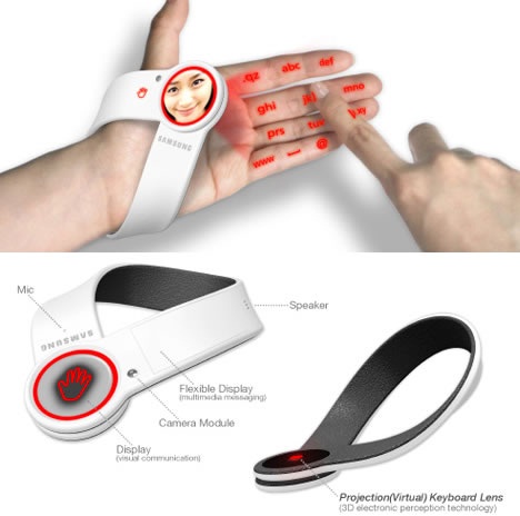 Короткого названия у данного концепта нет, так что придется запоминать длинное. Разработал его известный, в узких кругах, дизайнер Санман Куо. Этот «проектор» значительно расширяет функционал Вашей ладони. Портативное устройство одевается на запястье, а встроенный «проектор», проецирует клавиатуру непосредственно на вашу ладонь. Ну а дальше все как с привычной клавиатурой, «клацаем, клацаем, клацаем». Также присутствует небольшой, круглый дисплей.