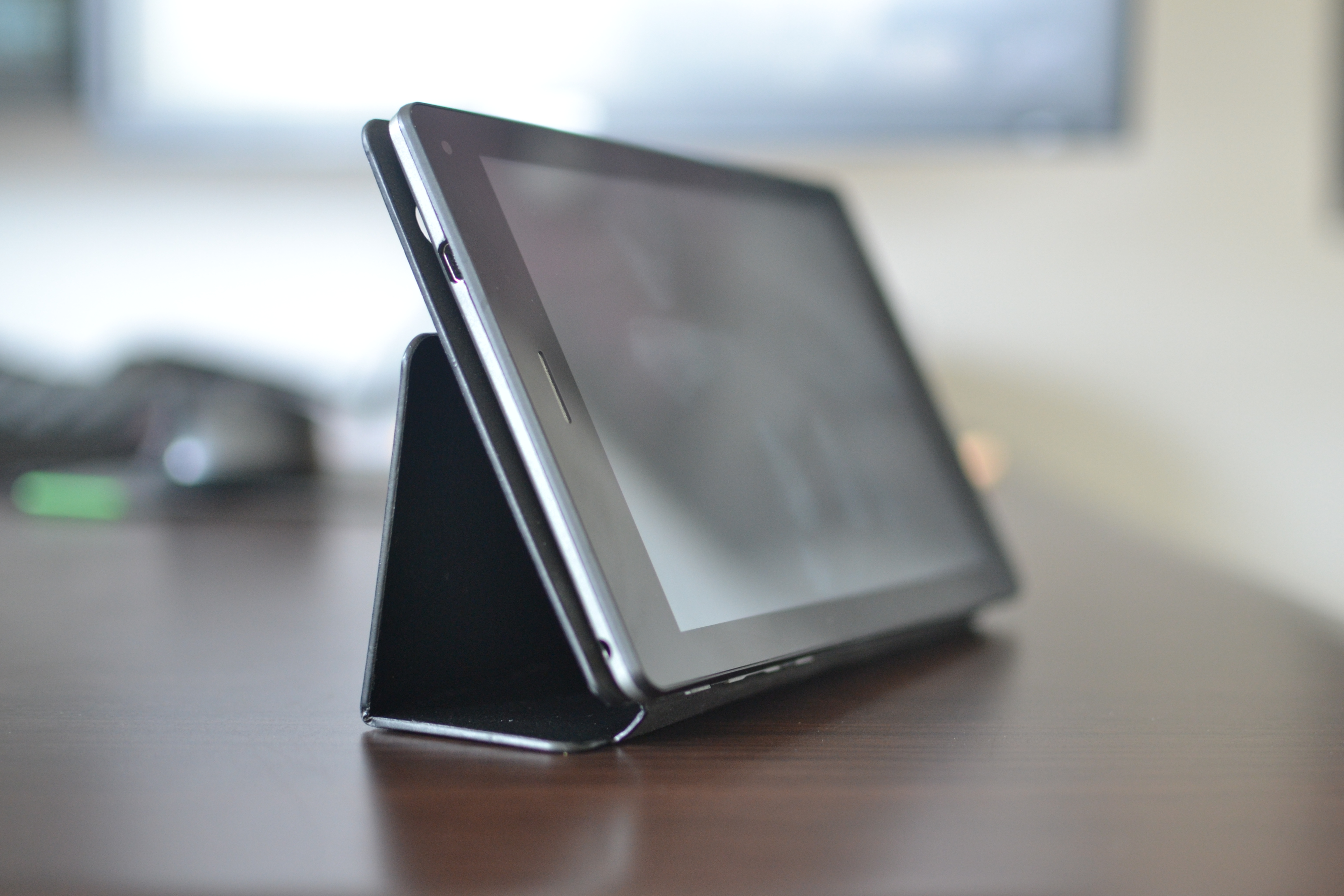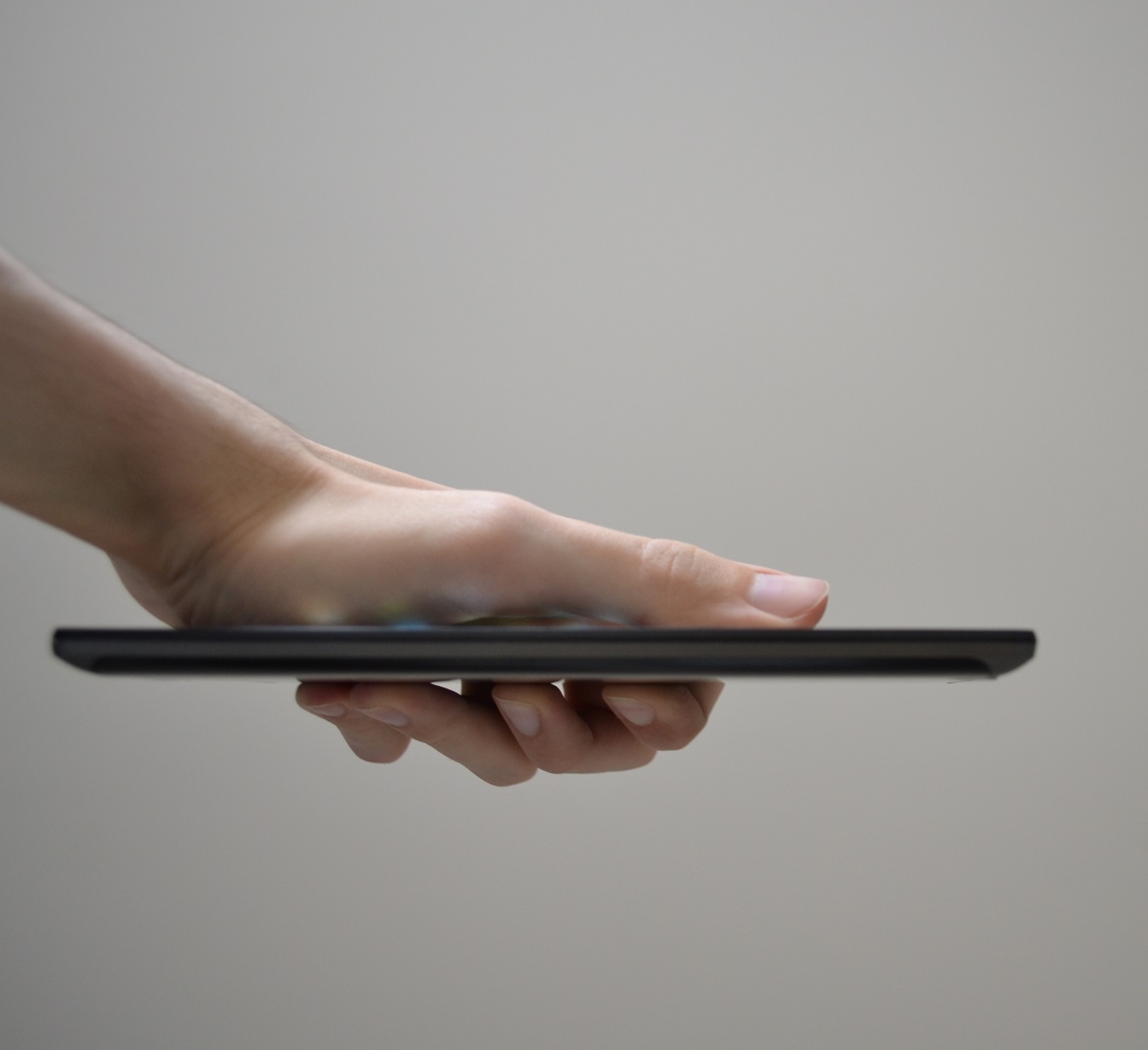 Дизайн в целом можно назвать строгим: чёрного цвета металлическая рама, немного скругленные углы — в руках планшет смотрится стильно. Корпус собран хорошо — ничего не люфтит и не скрипит, как например в случае с моим Galaxy Tab.