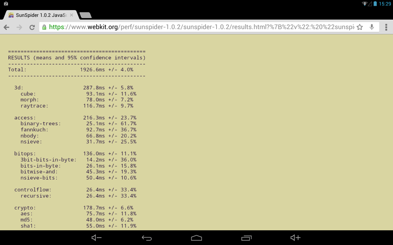 - SunSpider JavaScript Benchmark (Chrome): 1926.6