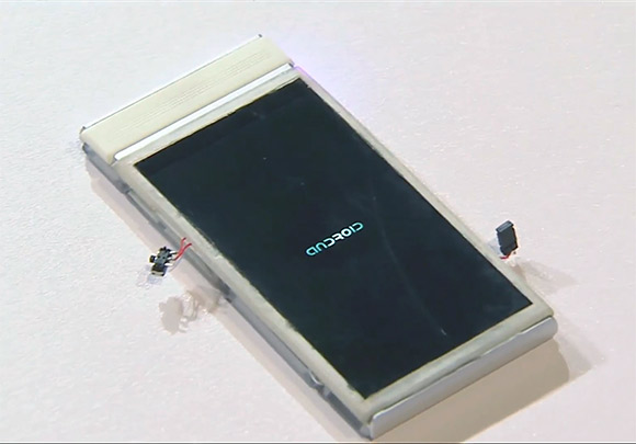 На сцену вышел Павел Еременко, руководитель проекта и показал действительно реально существующий аппарат. На нем не было кнопки включения, и чтобы запустить его, нужно физически замкнуть контакты. Его включили и… на экране отобразилась лишь половина часов и логотип Android. Причина по которой прототип так и не заработал — не известна. Но одно известно наверняка — физически данный телефон можно увидеть, подержать в руках, осознать концепцию данной модели и понять что Google не стоит на месте.