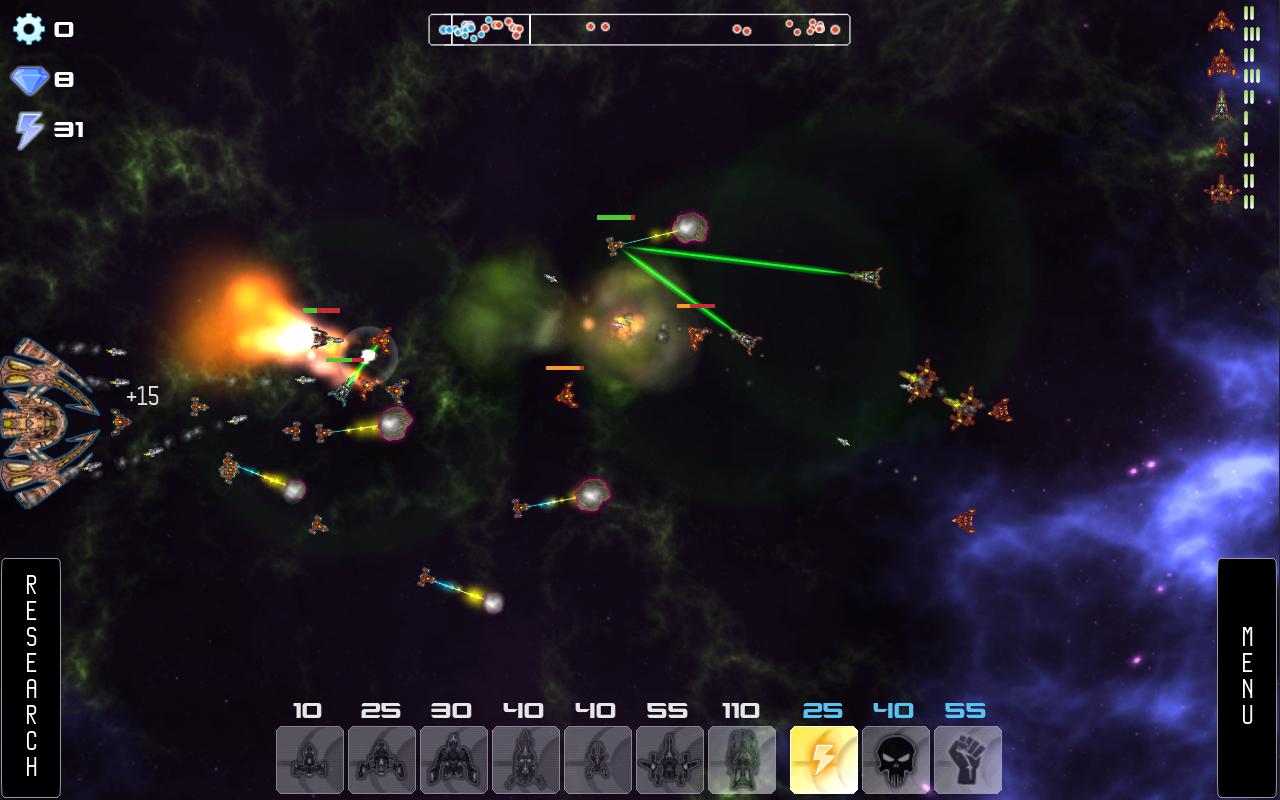 Весь стиль этой стратегии заключён в том, чтобы наштамповав 10 корабликов, добывающих ресурсы, купить за эти ресурсы другие, уже боевые корабли и жать все кнопки подряд с боевыми кораблями. Вот, собственно, вся игра... Никаких манёвров, обходов, и т.д, даже кораблями управлять нельзя. Нажми на кнопочку и караблик с упорством камикадзе устремится к противнику. Незнаю как остальным, мне в такие «стратегии» играть неинтересно.