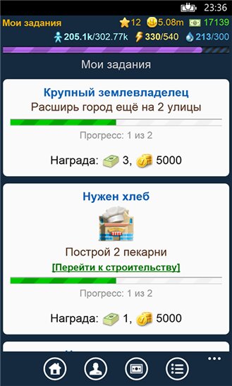 Инфраструктурные здания нужны для получения прибыли и увеличения лимита населения города. Жилые здания нужны для заселения жителей. А фабрики дают наибольшую прибыль. А для того, чтобы все здания могли нормально функционировать нужна энергия и вода, которую дают ресурсные здания. Грамотно распределяйте полученные доходы, и выбирайте нужные здания для строительства. В результате, Вы будете получать не только большой доход, но и построите красивый город!