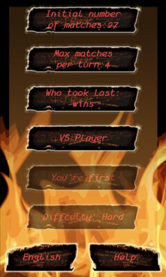 Из ряда спичек по очереди убираются спички от 1 до 3-9 (опционально) за ход. В зависимости от вашего выбора, взявший последнюю спичку, может как выиграть, так и проиграть.