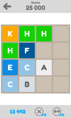 Счет увеличивается после каждого объединения букв. Чем больше счет, тем больше внутренней валюты ($) ты одержишь. С помощью этих денег можно Продолжить игру после того как заполнилась вся доска и нет больше ходов ), Удалить ненужную клетку с доски(во время игры) или Поменять две клетки местами. Соревнуйся с друзьями с помощью Facebook*! Нету Facebook*? У тебя есть виртуальные друзья — Ева, София, Патриот. Победи их! Побей их рекорды!