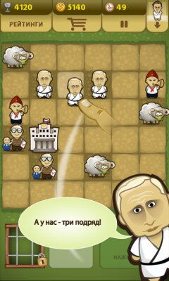 Цель игры проста – расставить все объекты на поле, мутировать их дальше и дальше. Три и более одинаковых фигурки рядом превращаются в новую фигурку. Депутаты – в Думу, Министры – в Правительство, и так далее. Каждый ход появляются новые фигурки, продолжай собирать их по три, продержись дольше всех, дойди до Премьера и Президента… а, может быть, и кого-то покруче!
