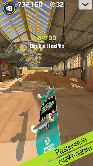 Получайте самые высокие очки в ограниченном во времени режиме соревнования, катайтесь без каких-либо ограничений и выполняйте задания в режиме джем-сешн, бросайте вызов друзьям в режиме многопользовательской поочередной игры S.K.A.T.E или экспортируйте видео-клипы и хвалитесь своими лучшими заездами.