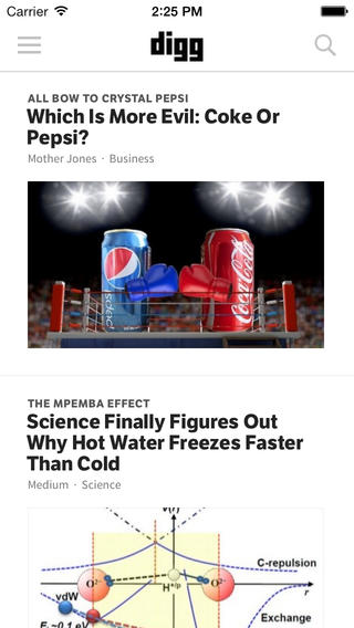 Digg предлагает вам самые интересные и обсуждаемые статьи из Интернета. На основе социальных сигналов и собственного опыта редакторы сервиса превращают хаотично разбросанные по Сети статьи, посты, журнальные вырезки, обновления статусов, фотографии и видео в элегантный микс под названием Digg. Теперь с новым Digg Reader стало ещё проще и быстрее следить за вашими любимыми источниками публикаций.