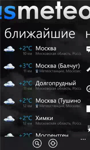 Gismeteo для Windows Phone — Программа, предоставляющая наиболее точный прогноз погоды для большого количества городов со всего мира. Просматривайте прогноз погоды по дням, часам и на две недели вперед. Так же вы сможете узнать направление и силу ветра, наличие осадков, атмосферное давление и проч. Следите за погодой в нескольких городах одновременно и переключайтесь между ними всего в несколько нажатий.
