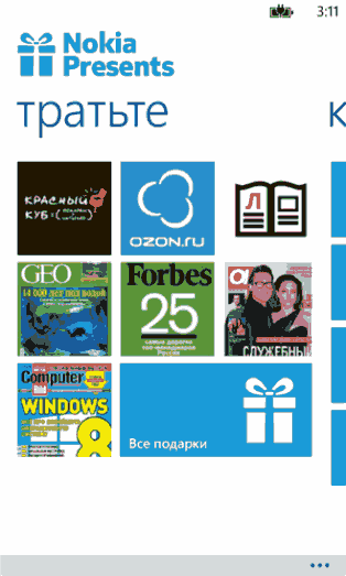 Nokia Presents – это программа лояльности, создана для всех владельцев мобильных устройств от Nokia, получила приложение для Windows Phone. Регистрируйтесь в системе и начинайте зарабатывать баллы за счёт использования вашего устройства. Все баллы потом можно потратить на сертификаты, позволяющие получить подарки и услуги, подписки на журналы и разные товары. Больше интересующей вас информации можно получить на официальном сайте. Баллы также насчитываются за регистрацию устройства, установку разных популярных приложений, заполнение анкет, просмотр и чтение новостей, лайки. Самое главное, что в ближайшее время, все заработанные баллы пользователи смогу тратить для N-Store, например, покупать аксессуары.