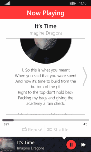 Любители музыки, слышали ли вы о программе GoMusic? Это просто невероятно, как производители смогли учесть все пожелания пользователей в одном приложение. Подумайте, что важно для музыкального плеера – внешний вид, громкость звука, быстрота и лёгкость в использовании? Каждый человек имеет определённо своё мнение. Эта программа не имеет ничего похожего на обычный WP-интерфейс «Metro», но тем не менее, она больше соответствует приложению на Android. Внешний вид плеера очень красиво придуман, он сам автоматически, по вашему желанию будет искать тексты к песням. Есть один минус – отсутствует плей-лист, но это невеликая потеря, по сравнению с его особенностями. Интерфейс немножко непривычный, но в целом удобный. Регулятор громкости можно вызвать свайпом нажав на полоску проигрываемой музыки.