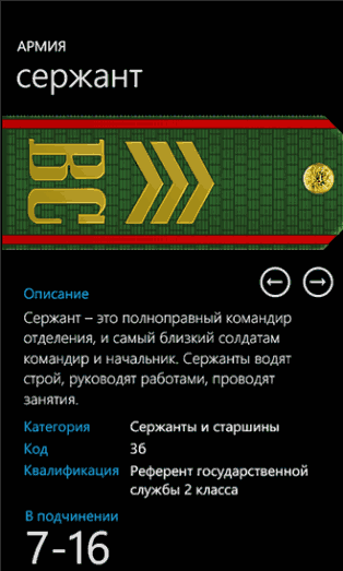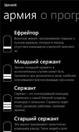 Приложение информационного характера, которое содержит в себе все звания Российской Федерации, а точнее внутренних сил. Программа будет очень полезна для пользователей, которые готовятся к службе в армии, для собственного саморазвития или просто возникло желание обращаться к стражам правопорядка по званию. Приложение обладает приятным и качественным интерфейсом в стиле Metro, а изюминкой является раздел “Советы от служащего”