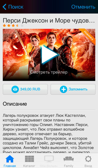 Программа обеспечивает комфортный доступ к большой базе фильмов, мультфильмов и телесериалов (свыше 4000 наименований) для онлайн- и оффлайн-просмотра. Фильмы можно приобретать по отдельности или пакетами, есть также довольно обширная подборка бесплатных классических кинолент. Каждый фильм снабжён аннотацией, данными о режиссёрах, актёрах и т.д., информацией о сборах и рейтингах, а также трейлерам и рекомендациями от кинокритиков и пользователей. Кроме того, с приложением можно работать с ТВ, плеера с функцией Smart TV или с ПК даже во время просмотра выбранного фильма. Интерфейс программы простой и удобный, в приятной светлой цветовой гамме. Программа бесплатная, приобретать нужно только фильмы.