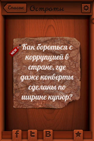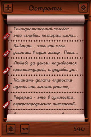Программа представляет собой обширную подборку разнообразных острот, многозначительных фраз и ехидных высказываний. Понравившиеся цитаты можно отправить по почте или поделиться ими в соцсетях. Также можно добавлять свои фразы. Интерфейс приложения красивый, окно для чтения представлено в виде «свитка» и пролистываются сверху вниз или снизу вверх. Программа бесплатная, при желании можно вознаградить разработчиков.