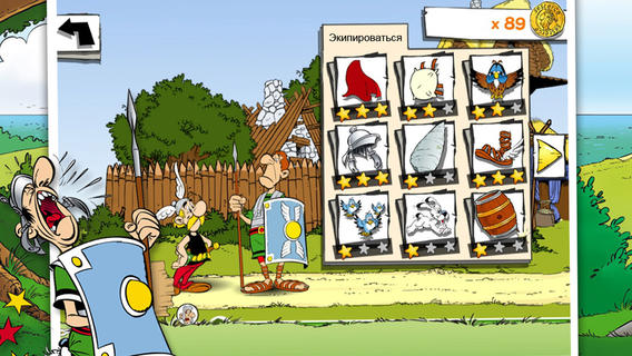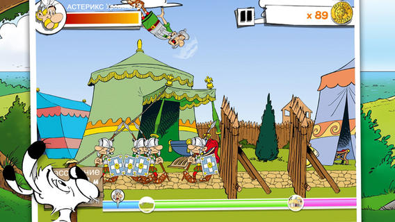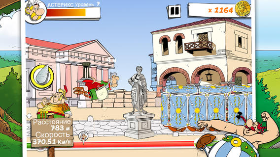 Главный герой игры — персонаж известного комикса, древний римлянин Астерикс. Участнику нужно «придать ускорение» Астериксу с помощью оплеухи так, чтобы римлянин пролетел как можно дальше, собирая по дороге различные бонусы, сшибая викингов, римлян, пиратов и других персонажей игры (главное при этом — не упасть на забор: на этом игра заканчивается). В игре множество локаций и героев комикса, есть различные приспособления и персонажи, которые помогут Астериксу пролететь дальше (их можно разблокировать за набранные очки или купить во встроенном магазине), а также карточки с историями героев. Графика игры простая и качественная, в стилистике комикса. Можно соревноваться с друзьями через Game Center, причём эта функция реализована весьма необычно и весело. Игра бесплатная.