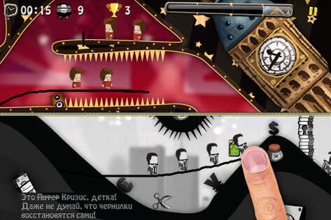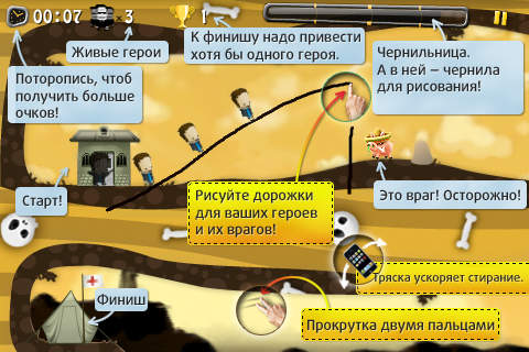 В этой игре нужно помочь команде супергероев преодолеть все препятствия и спасти мир от эпидемии, экономического кризиса и коварных пришельцев. Путешествуя по разным уголкам мира, нужно дорисовывать мосты над препятствиями и преграды для соперников — рисовать можно пальцем по экрану, стараясь точно рассчитать время (нарисованные элементы через несколько секунд исчезают) и экономить «чернила», а также сделать траекторию максимально удобной для путешественников. В игре 20 уровней возрастающей сложности в 5 различных локациях. Графика создана в необычном приятном стиле, геймплей исключительно захватывающий, управление простое — нужно только передвигать картинку двумя пальцами. Игра бесплатная, дополнительные уровни можно приобрести отдельно.