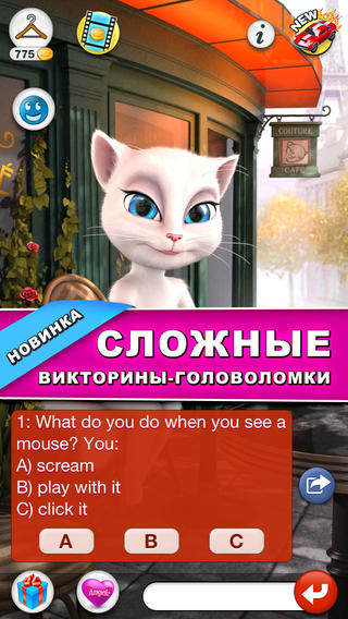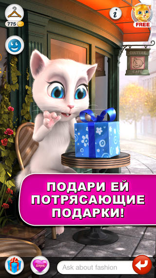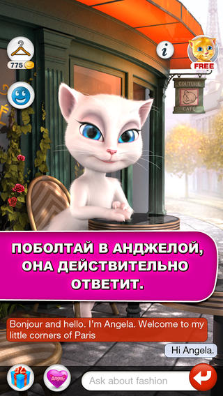 Те, кто знаком с рыжим котом Томом, знают и его подругу — красавицу-кошечку Анджелу. Она умеет не только повторять всё сказанное, как и Том, но и улыбается в ответ, и даже отвечать на фразы! Правда, понимает она только английский язык. Но с Анджелой можно не только общаться — ей нужно покупать обновки и лакомства, гладить её по белой шёрстке, помогать наряжаться и даже прогуляться с ней по Парижу. Ещё Анджела любит печенья с предсказаниями, умеет петь и может поиграть в интересные викторины.