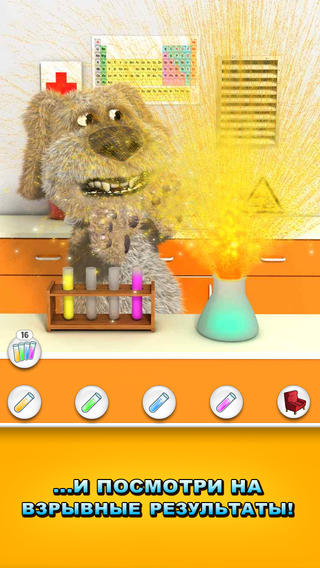 Интерактивная игра даёт возможность поселить в мобильном устройстве забавного рыжего пса по имени Бен — отставного профессора химии, чудаковатого и ворчливого, не оставившего своих научных занятий даже на пенсии. Чтобы поиграть с Беном или попасть в его лабораторию, где можно проводить весёлые опыты, вначале нужно отвлечь его от любимой газеты, стукнув по ней и подёргав за уголок. Сложив газету, Бен будет готов пообщаться! С ним можно поболтать — он повторит всё, что скажет хозяин, — позвонить ему по телефону, пощекотать его, подраться и, конечно, заняться химическими исследованиями. А ролики общения с Беном можно сохранять в видеофайлы, размещать их в социальных сетях или отправлять друзьям по почте и в MMS.