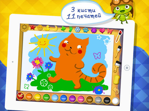 В приложении «Рисование и раскраска» присутствует два режима игры — «раскрась картинку» и «нарисуй сам». Первый режим позволяет ребенку раскрашивать выбранную картинку в различные цвета. На текущий момент в этом режиме присутствует 18 картинок, а также 15 цветов, каждый из которых можно смешивать для получения нового.